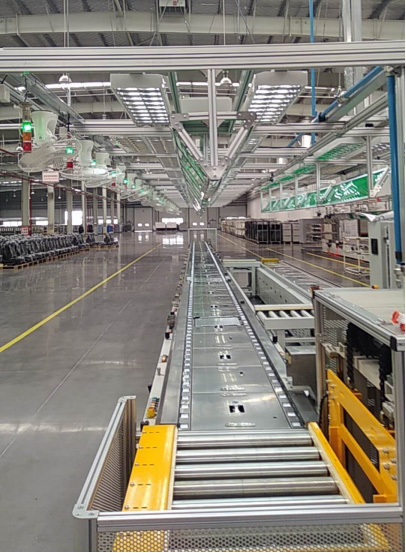 線體采用摩擦輪運(yùn)輸工裝板,各個(gè)摩擦輪之間通過(guò)鏈條連接,動(dòng)力來(lái)源于減速電機(jī),線體結(jié)構(gòu)可分為環(huán)形、單層、雙層(因成本考慮一般雙層的下層采用倍速鏈設(shè)計(jì)),整線采用PLC控制,方便快捷。